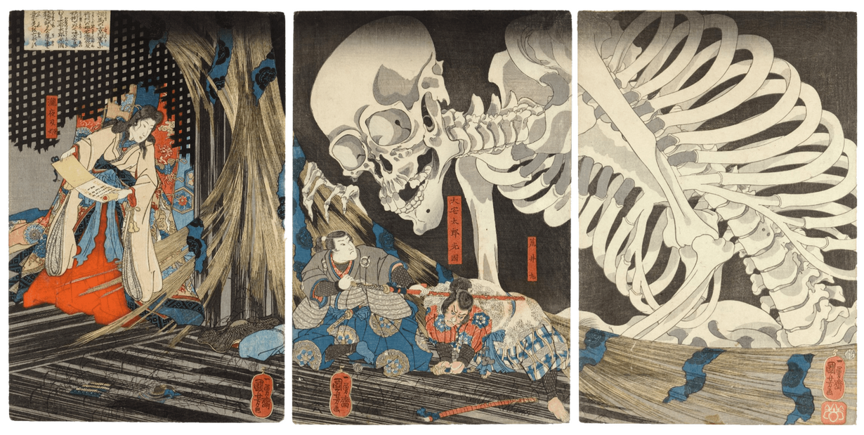This led me to the discovery of one of Japan’s oldest artwork: Utagawa Kuniyoshi’s depiction of “Takiyasha-hime Summoning a Skeleton at the Haunted Old Palace at Sōma”. An old color woodblock print of the Edo Period depicting the tale of Princess Takiyasha as she summons a skeleton specter in order to frighten Oya Taro Mitsukuni at her father’s ruined mansion in Soma. The piece talks about how the princess has used an other worldly creature in order to seek revenge over the man that killed and ended his father’s reign. What I mainly found distinct about the piece was its depiction of an empty void and how the specter bends the images space similar to how a portal opens up to another world.When recreating this image for my work I used yarn attached to the walls of my apartment as a way of distorting the space similar to what the print depicts as the creature rips down the mansion’s walls. Line work has also been heavily used to create the illusion that the yarn has somehow changed the apartment's dimensions. I’ve also recreated the black void by covering the walls with black cartolina placing it next to the yarn installation making it feel like the space has been altered and deformed. Lastly, I used illustration boards and markers to recreate some parts of the specter making it look like it’s emerging from my apartment window. Through stippling I created patterns around the bones making its shape more distinct, utilizing point and line to create its final image.